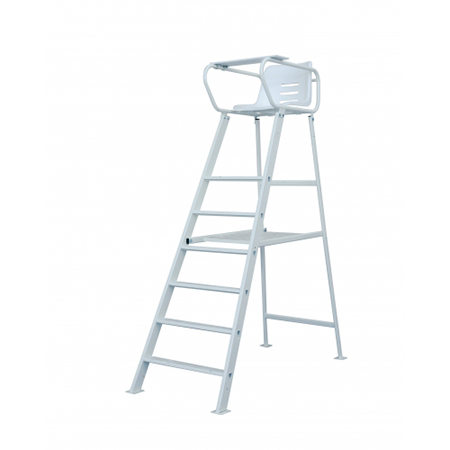 Para tener una vista completa de la pista de tenis o del campo deportivo, se requiere una altura adecuada de la silla de árbitro. Por esta razón, la silla se fabrica según los estándares establecidos por la ITF, ATP y WTA. La altura total es de 2,21 m y la altura del asiento es de 1,85 m. La seguridad de nuestros clientes es la prioridad en la fabricación de nuestros productos. La silla de árbitro de tenis está equipada con escalones anchos y antideslizantes, con pequeñas ranuras incorporadas para garantizar un buen agarre. Se han tomado varias medidas de seguridad para asegurar que la silla esté estable en cualquier superficie. Las patas cuentan con una placa para aumentar la superficie de apoyo y evitar que se hunda en el suelo. Además, se añade una bandeja como estabilizador adicional, donde se pueden colocar bebidas o útiles de escritura.